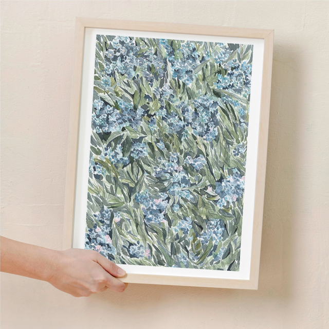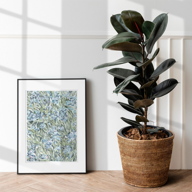 Ilustracija Spominčice je na voljo v velikostih A4 in 30 cm x 40 cm. Motiv je tiskan v Sloveniji, na 300 g visokokakovostni in okolju prijazen recikliran papir Shiro Eco.