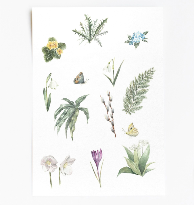 Tehnika originalne ilustracije: akvarel (2023), motiv slovenskega cvetja